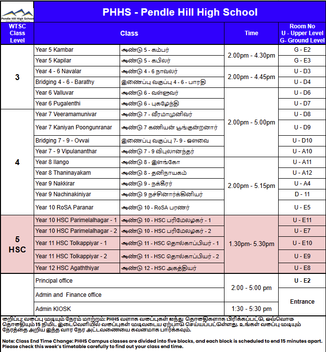 மாணவர்களை 66 Binalong Rd, Toongabbie ல் அமைந்துள்ள பென்டில்கில் உயர்தர பாடசாலையின் பிரதான நுழைவாயிலின் வழியாக மட்டும் பாடசாலை வளாகத்திற்குள்  நுழைய முடியும்.
