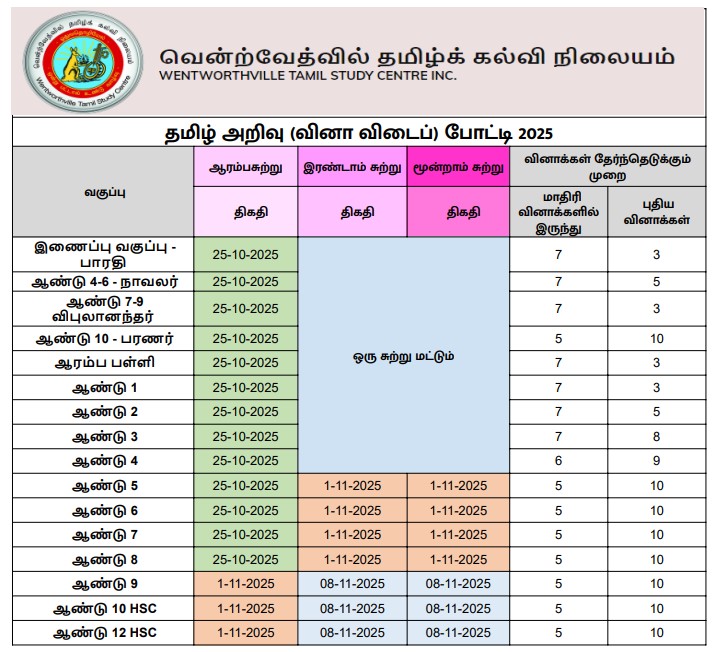 WTSC Quiz competitions are part of the Tamil school curriculum for classes from Kinder to HSC. All students are expected to participate.